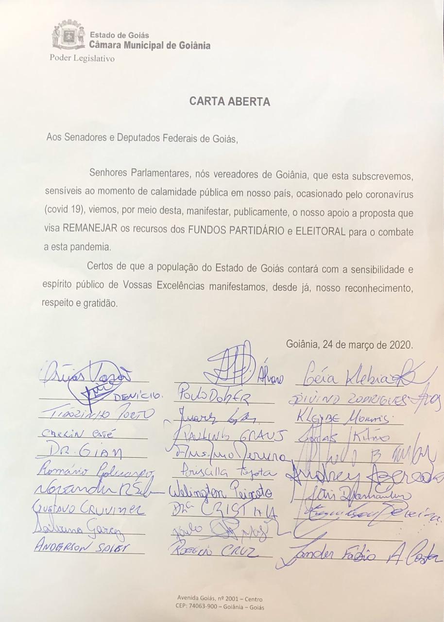 Vereadores por Goiânia apresentaram carta aberta a deputados federais e senadores por Goiás para que haja remanejamento dos fundos eleitoral e partidário para ações de combate e mitigação da pandemia do Covid-19 em território brasileiro. O documento foi assinado por todos os vereadores presentes na sessão realizada na terça-feira, 24, na Câmara Municipal.