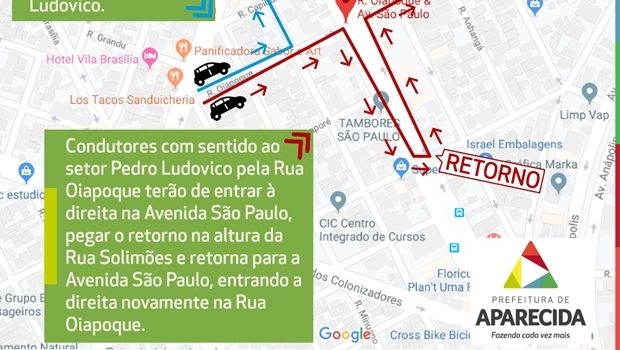 Após a entrega da obra, os veículos terão que virar à direita na Avenida São Paulo, entrarem no retorno mais abaixo da via, voltando pela São Paulo no sentido Goiânia, e, depois, entrar à direita na Rua Oiapoque, sentido Setor Pedro Ludovico. Outra opção para os motoristas que trafegam pela Oiapoque é passar pela Avenida das Bandeiras e seguir até o semáforo do cruzamento da Avenida Tapajós com Rudá, no elevado da trincheira.