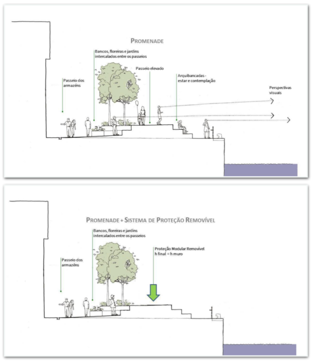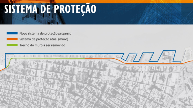O projeto inclui a remoção de 1 km do muro para a instalação da nova estrutura, que protegeria também os armazéns transformados em espaços de lazer. Segundo o edital, a nova alternativa precisaria ser aprovada pelos órgãos competentes antes da remoção parcial da estrutura de concreto.