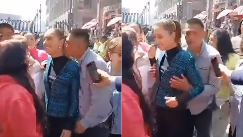 Nas imagens, Sheinbaum aparece cumprimentando pessoas quando um homem se aproxima por trás, coloca o braço em volta dos ombros dela e tenta beijar seu pescoço. Em seguida, ele ainda tenta tocar os seios da presidente, que o afasta de forma calma, enquanto um segurança intervém para afastar o agressor.