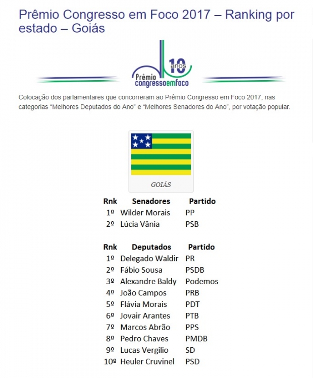 Na 10ª edição do prêmio “Congresso em Foco”, o senador Wilder Morais (PP) e o deputado federal Delegado Waldir (PR) foram escolhidos os melhores parlamentares da bancada de Goiás, segundo o voto popular.
