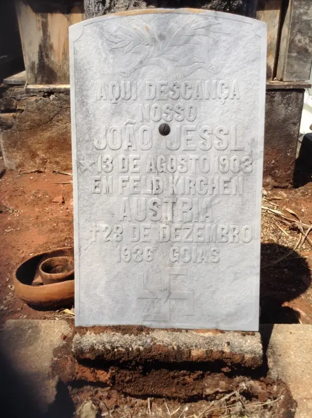 A lápide pertence a Johann (João) Jessl, morto em 28 de dezembro de 1936, aos 33 anos, na então capital goiana. A inscrição registra: “Aqui descansa nosso João Jessl – 13 de agosto de 1903 – em Feldkirchen, Áustria – 28 de dezembro de 1936, Goiás”. Logo abaixo, uma suástica foi gravada na lápide.